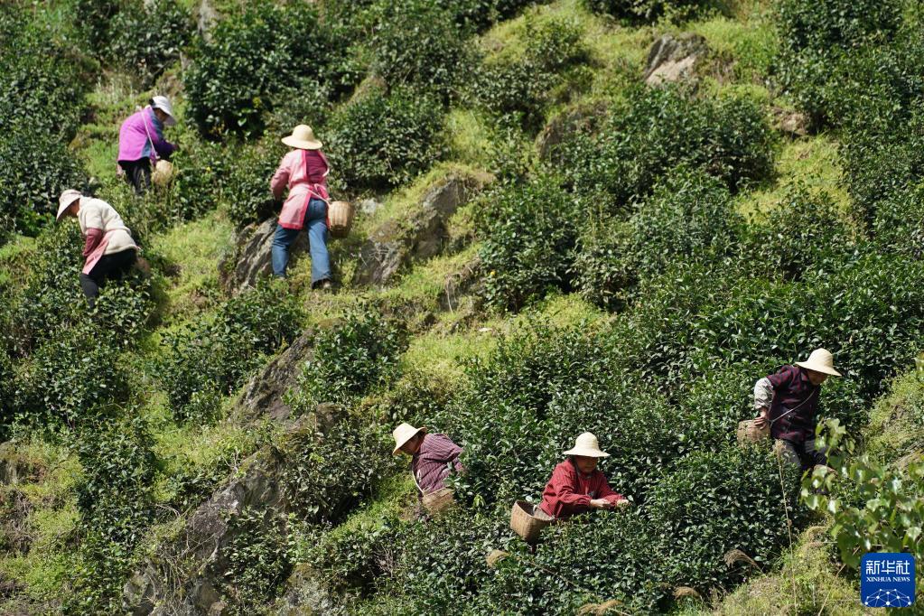 4月6日,茶農在安康市紫陽(yáng)縣煥古鎮的茶山上采茶。