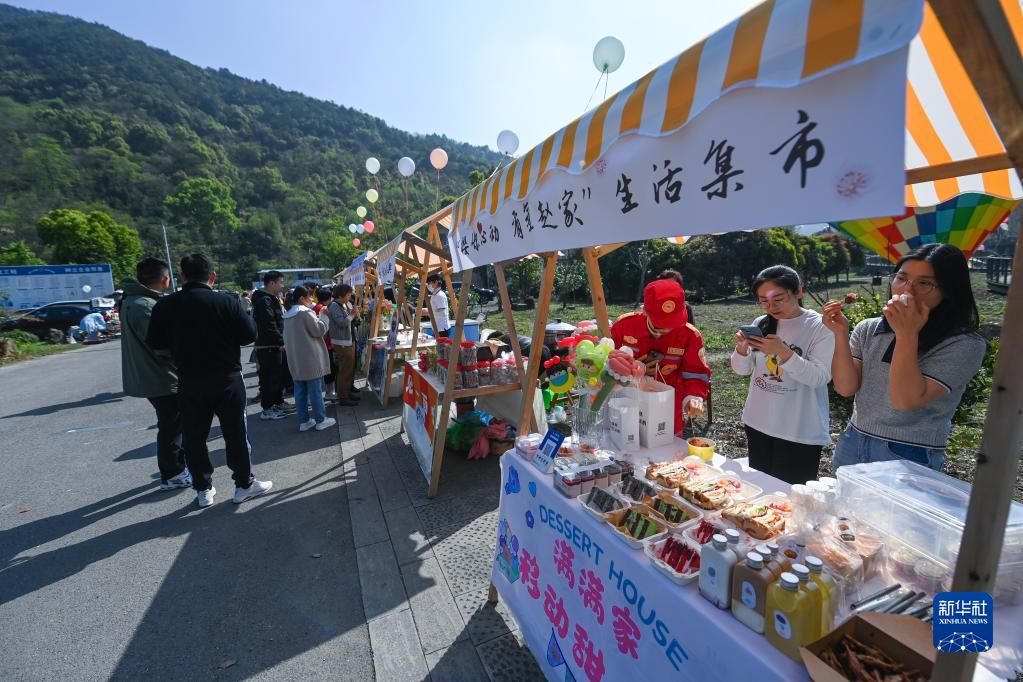 4月8日,浙江省諸暨市趙家鎮東溪村舉行的春日山野市集設置免費攤位,推廣優(yōu)質(zhì)農副產(chǎn)品以及網(wǎng)紅美食,吸引游客前來(lái)了解選購。