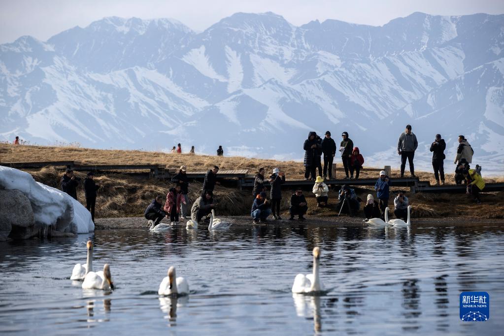 4月6日,游客在欣賞賽里木湖的景色。