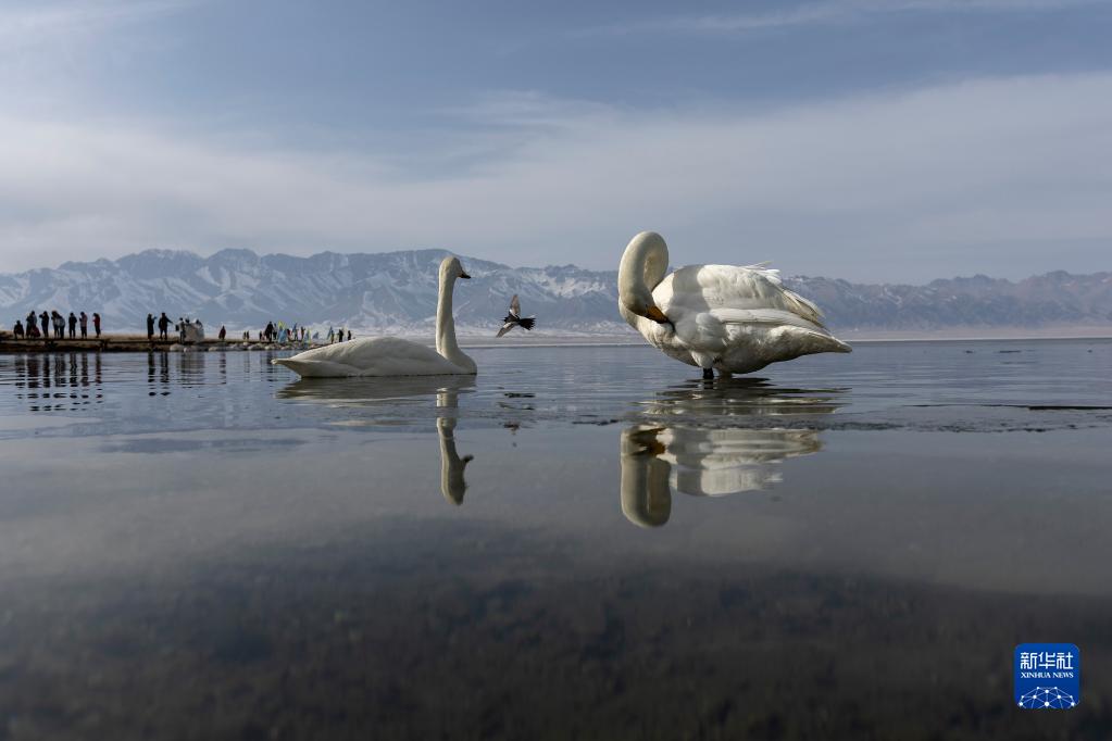 4月6日,兩只天鵝在賽里木湖休憩。