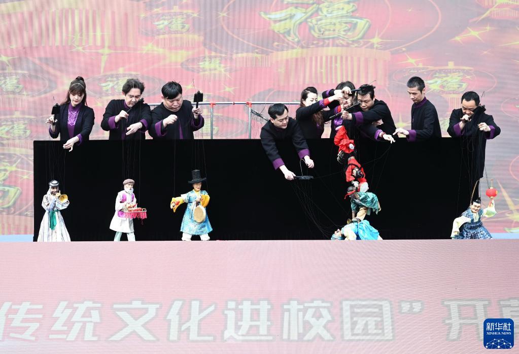4月8日,泉州市提線(xiàn)木偶戲傳承保護中心演員在福州大學(xué)城“優(yōu)秀傳統文化進(jìn)校園”開(kāi)幕式上表演提線(xiàn)木偶戲《元宵樂(lè )》。