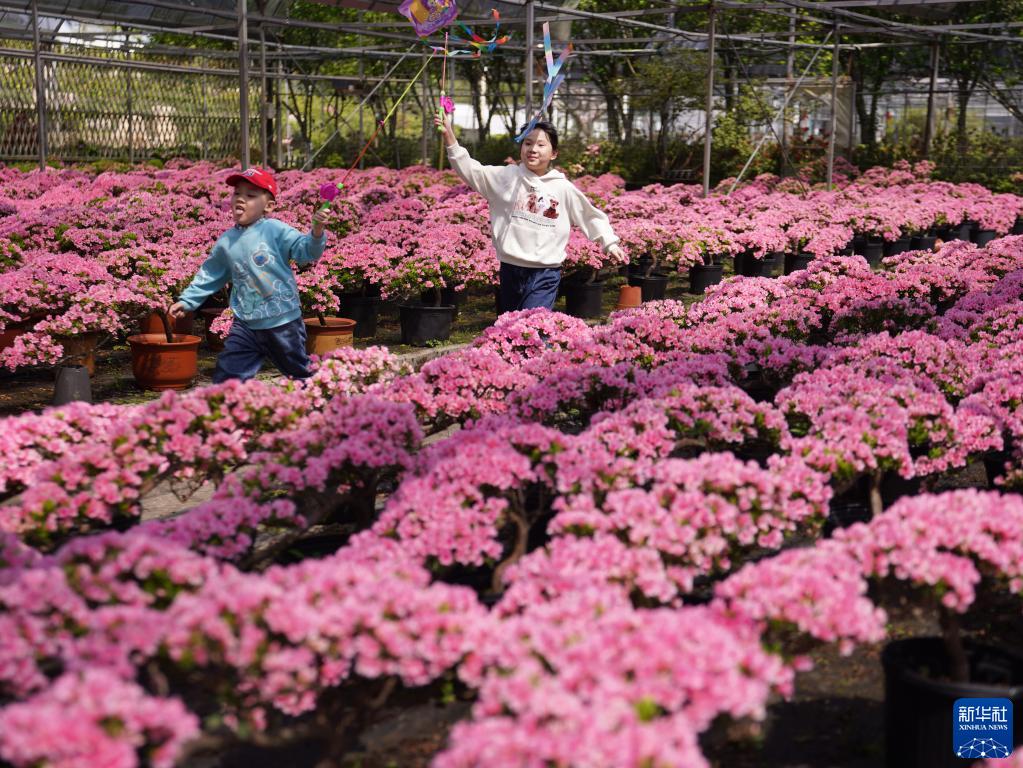 4月8日,小朋友在嘉善縣大云鎮碧云花園的造型杜鵑盆景區玩耍。