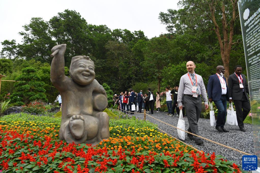 4月8日,外國嘉賓觀(guān)賞2023粵港澳大灣區花展作品《文脈傳承——煙火里的幸福成都》。