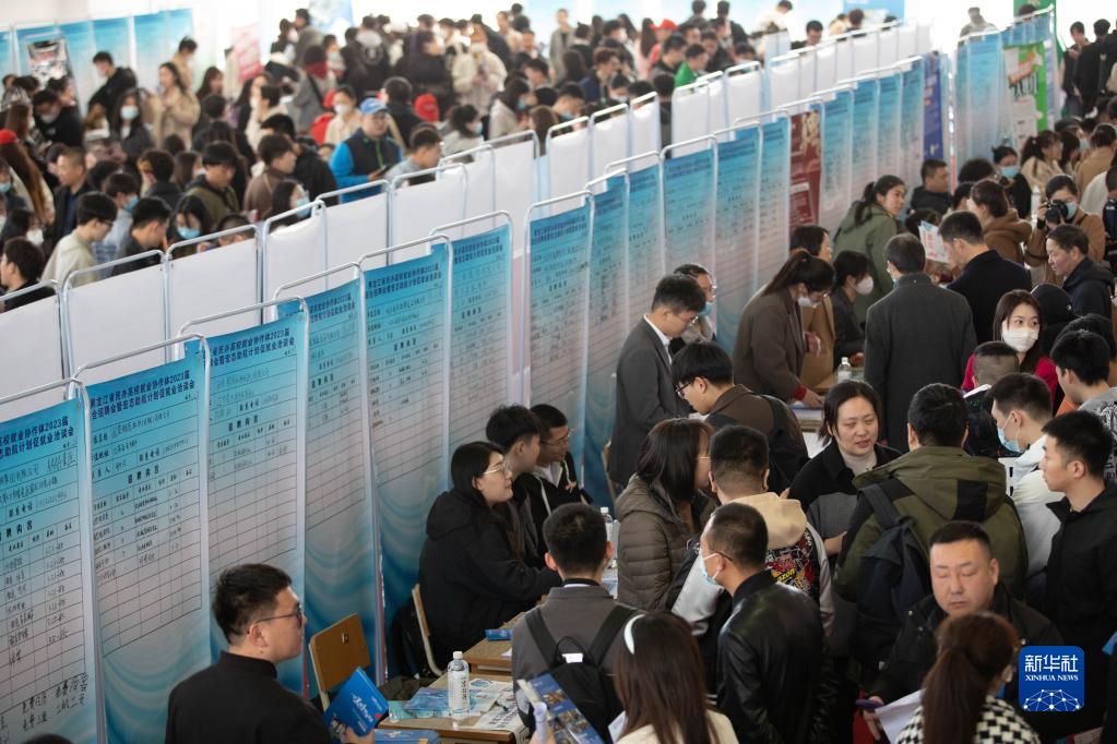 4月8日,求職者在黑龍江省民辦高校就業(yè)協(xié)作體2023屆聯(lián)合招聘會(huì )現場(chǎng)瀏覽崗位信息。