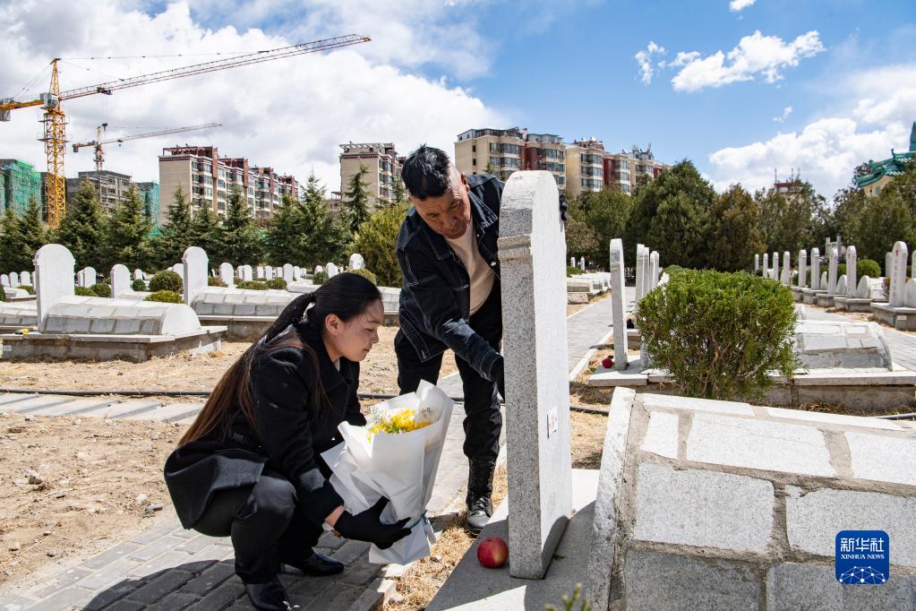 在拉薩烈士陵園,索朗拉姆和父親桑珠為無(wú)名烈士掃墓(4月5日攝)。
