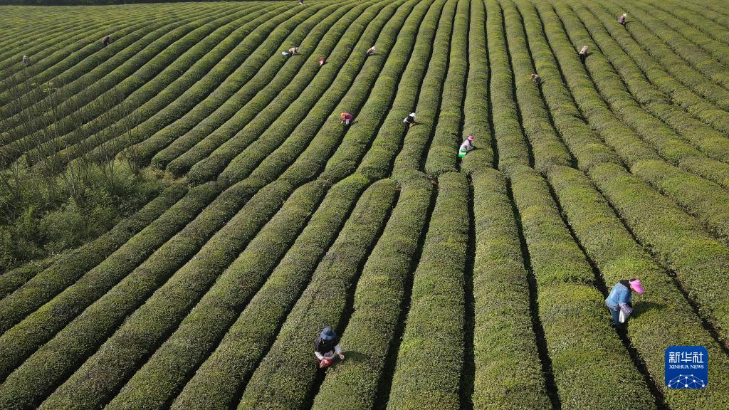 4月7日,采茶工在敬亭山山腳下的一處茶園里采茶(無(wú)人機照片)。