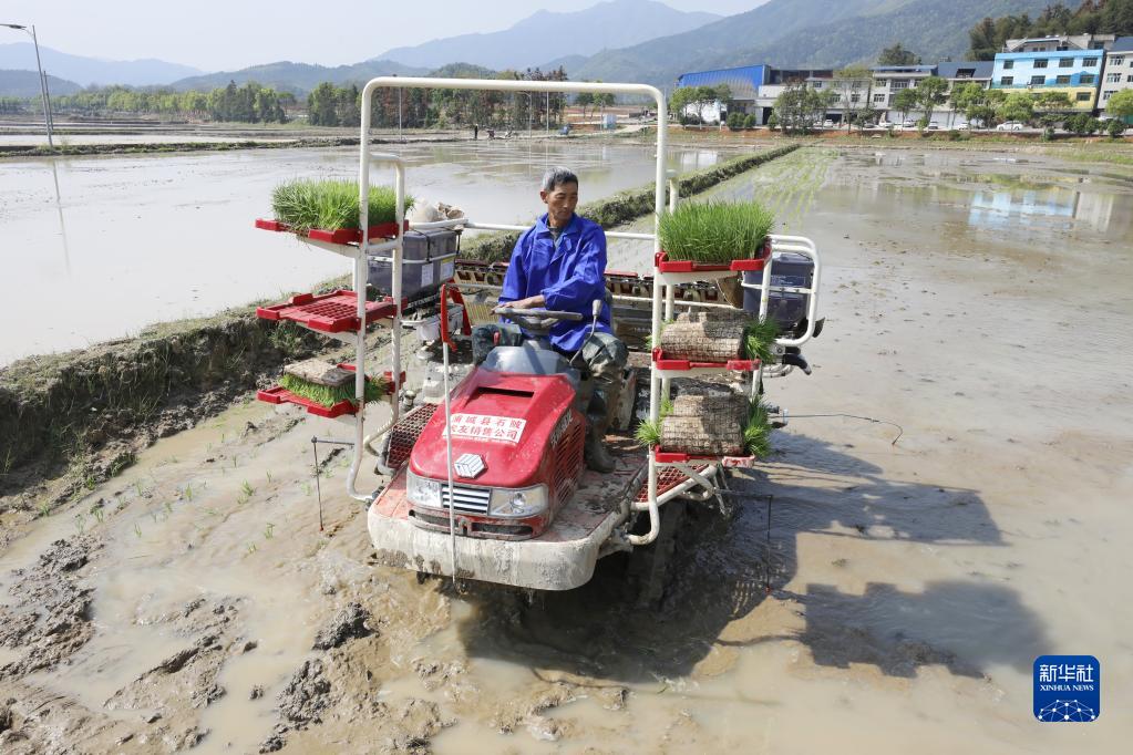 4月8日,在浦城縣石陂鎮高標準農田,農民駕駛插秧機開(kāi)展再生稻插秧作業(yè)。