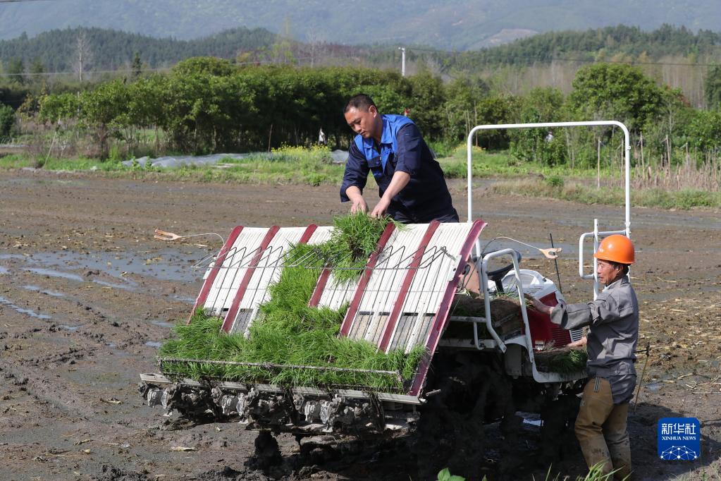 4月7日,浦城縣臨江鎮萬(wàn)鑫家庭農場(chǎng)負責人馬芳華往插秧機上放置再生稻秧苗。