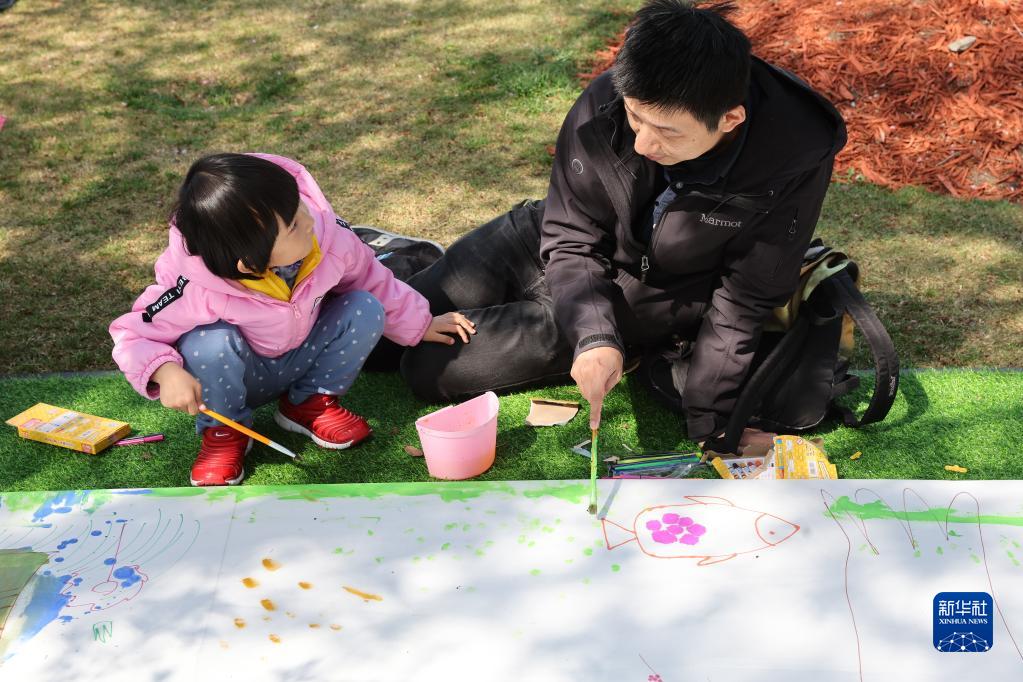 4月8日,家長(cháng)和孩子在上海市寶山區顧村公園“櫻畫(huà)書(shū)藝”活動(dòng)上創(chuàng )作。