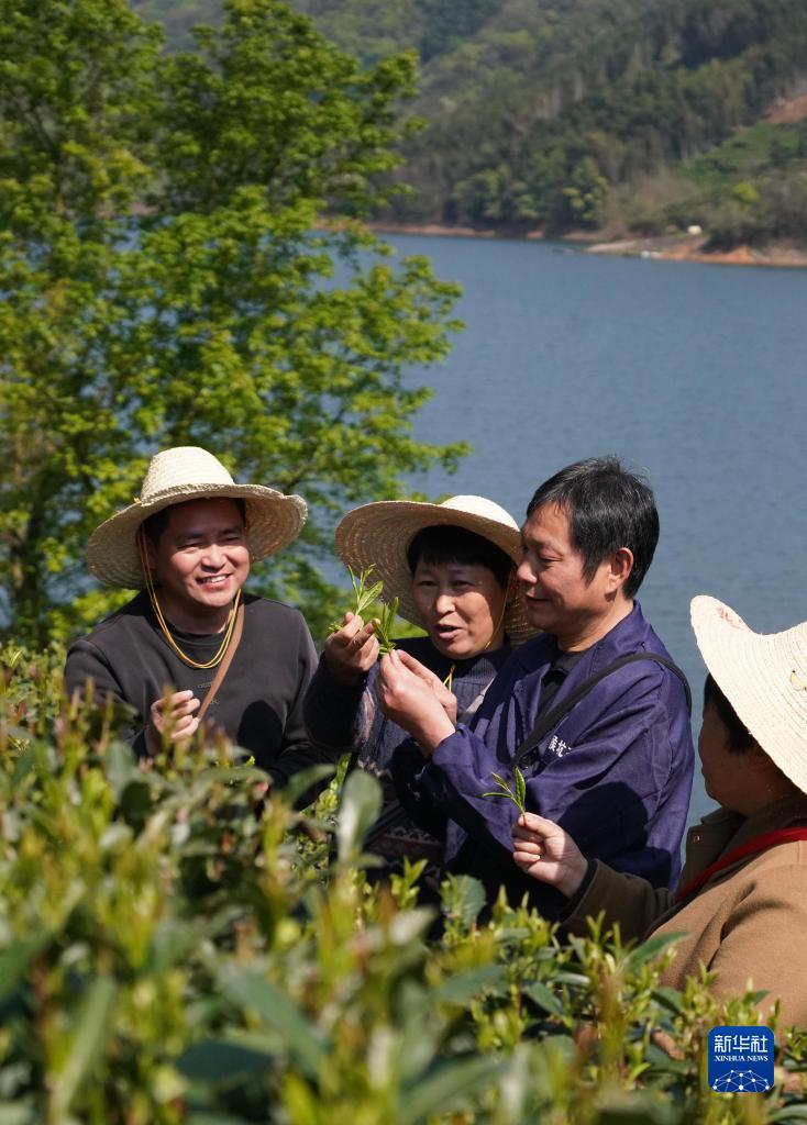4月8日,在黃山市黃山區新明鄉猴坑村茶園,國家級非遺項目太平猴魁制作技藝代表性傳承人方繼凡(右二)在了解茶葉品質(zhì)。
