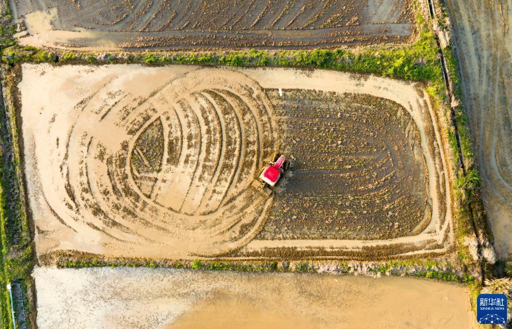 4月7日,在江西省九江市都昌縣蔡嶺鎮楊灣村,農民駕駛農機翻耕稻田(無(wú)人機照片)。