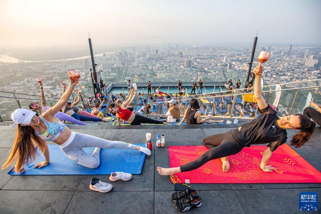 當日,數十名瑜伽愛(ài)好者在曼谷王權云頂大廈頂層觀(guān)景平臺體驗高空瑜伽。