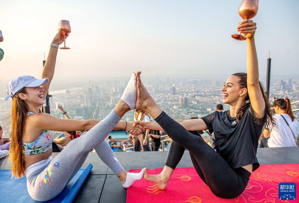 當日,數十名瑜伽愛(ài)好者在曼谷王權云頂大廈頂層觀(guān)景平臺體驗高空瑜伽。