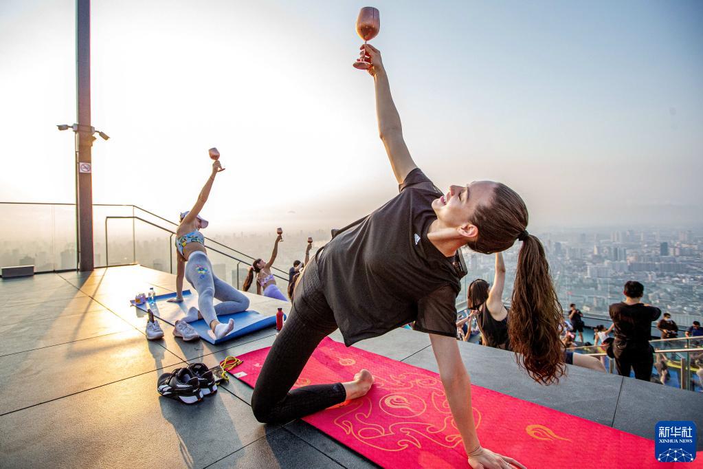 當日,數十名瑜伽愛(ài)好者在曼谷王權云頂大廈頂層觀(guān)景平臺體驗高空瑜伽。