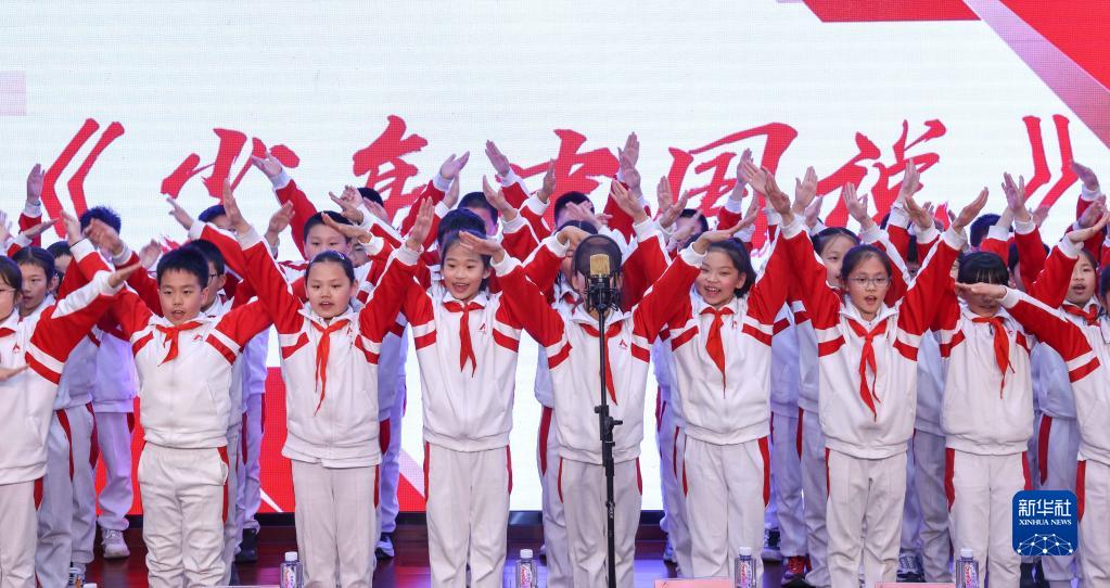 4月7日,人大附中分校小學(xué)部的學(xué)生表演《少年中國說(shuō)》。