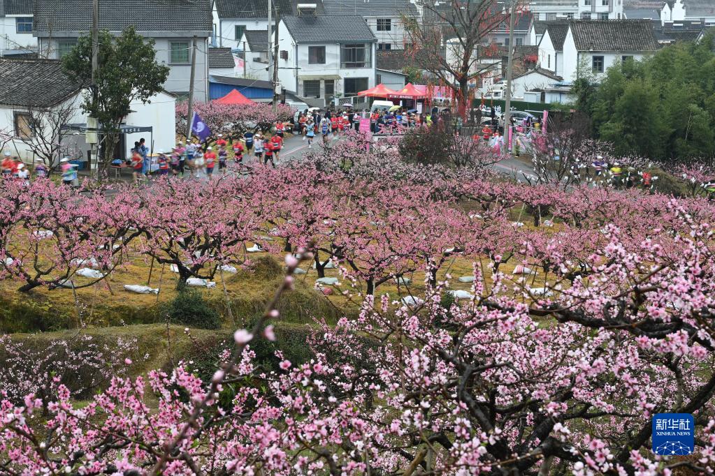 參加馬拉松比賽的選手經(jīng)過(guò)浙江省寧波市奉化區蕭王廟街道林家村的一片桃園(2023年3月19日攝)。