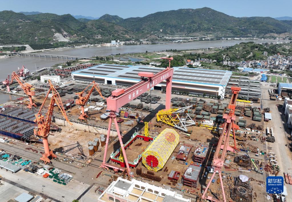 4月9日在馬尾造船股份有限公司總組場(chǎng)地拍攝的“乾動(dòng)2號”深遠海養殖平臺(無(wú)人機照片)。