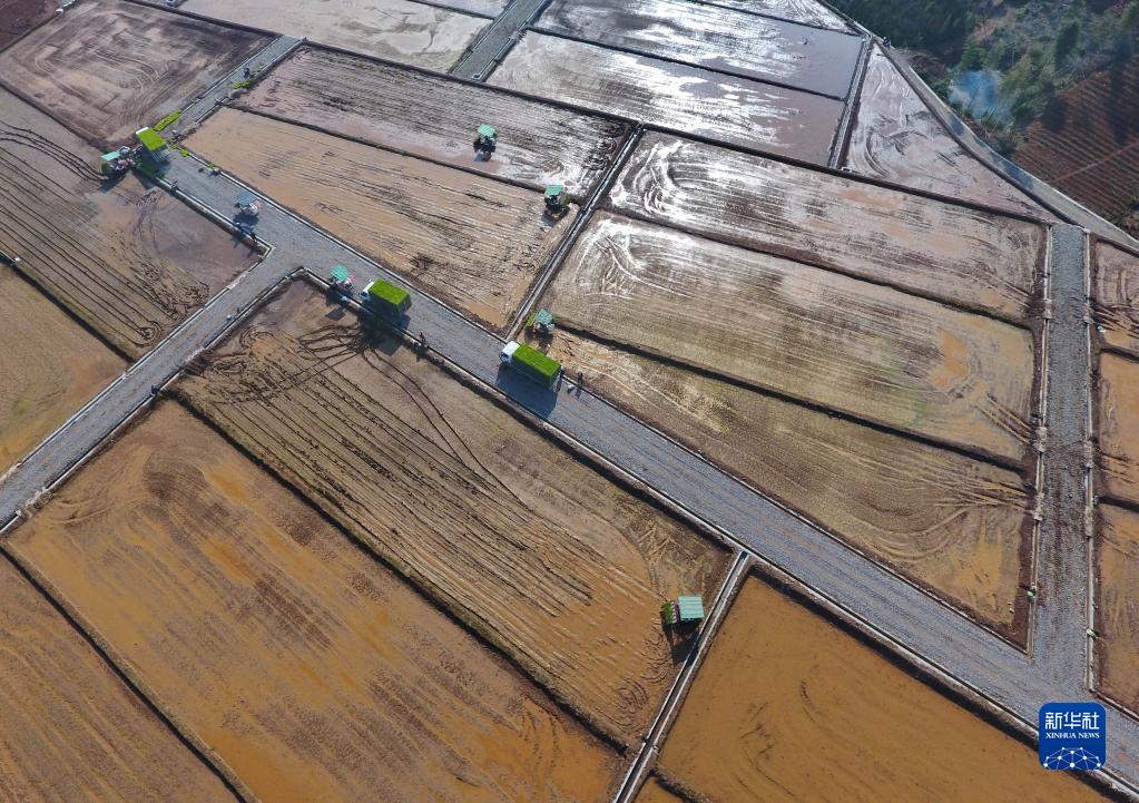 春光明媚,萬(wàn)物生長(cháng),農民在田間勞作,到處生機勃勃。