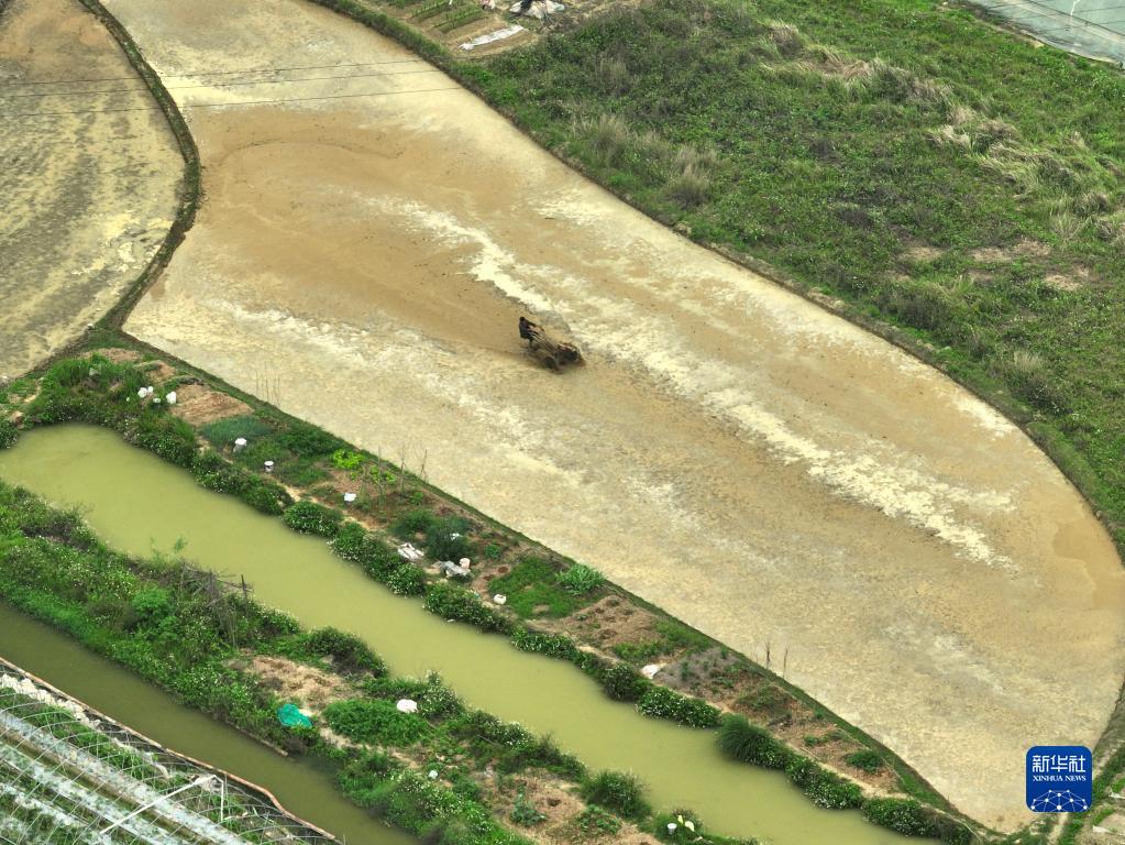 4月9日,村民在廣西南寧市青秀區仙葫經(jīng)濟開(kāi)發(fā)區那舅社區那平村耕田(無(wú)人機照片)。