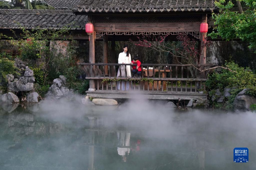 4月9日,在黟縣碧陽(yáng)鎮石亭村的民宿拾庭畫(huà)驛的庭院中,一對母子在賞景。