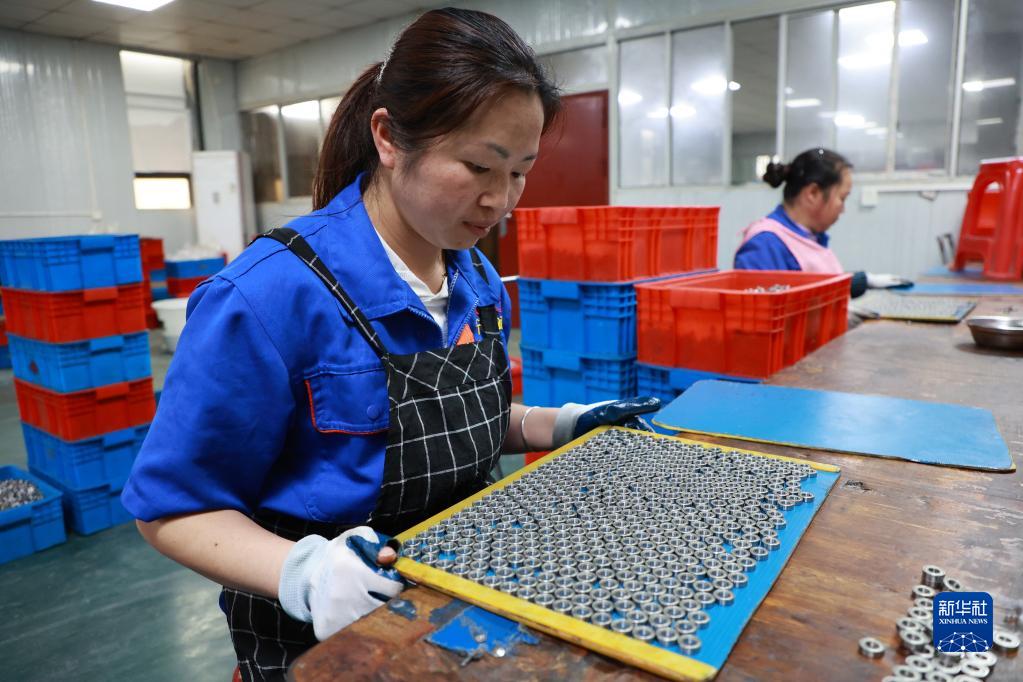 4月10日,搬遷群眾在獨山縣望城社區安置點(diǎn)附近的軸承產(chǎn)業(yè)園區內檢查成品軸承質(zhì)量。