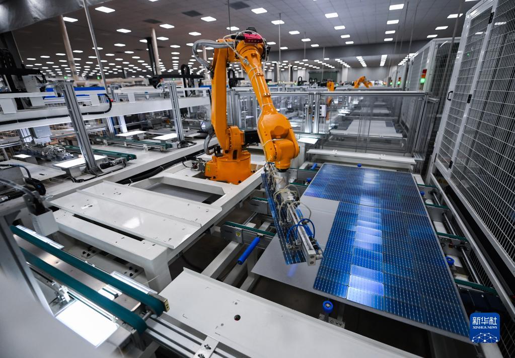 4月11日,在位于湖州吳興區織里鎮的浙江貝盛綠能科技有限公司的車(chē)間內,自動(dòng)化流水線(xiàn)在加緊生產(chǎn)出口歐洲的光伏組件。