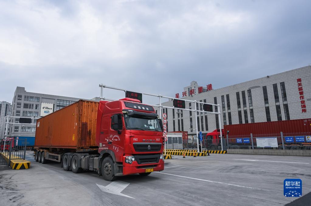 4月11日,滿(mǎn)載著(zhù)出口貨物的集裝箱車(chē)輛在吳興織里港海關(guān)監管作業(yè)場(chǎng)等候通關(guān)。