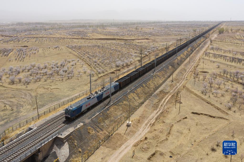 重載列車(chē)行駛在大秦鐵路上(4月11日攝,無(wú)人機照片)。