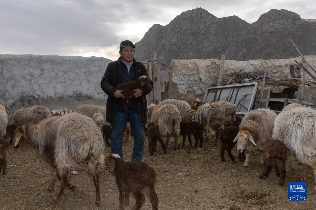 4月10日清晨,在阿合奇村,阿不都別克把小羊趕到一起,讓小羊吃奶。