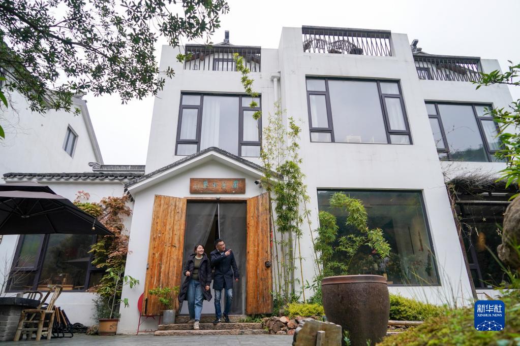 4月6日,在樹(shù)山村里的民宿“蘭兮小筑”,彭銳(右)和老板俞慧聊天交流。 新華社記者 李博 攝