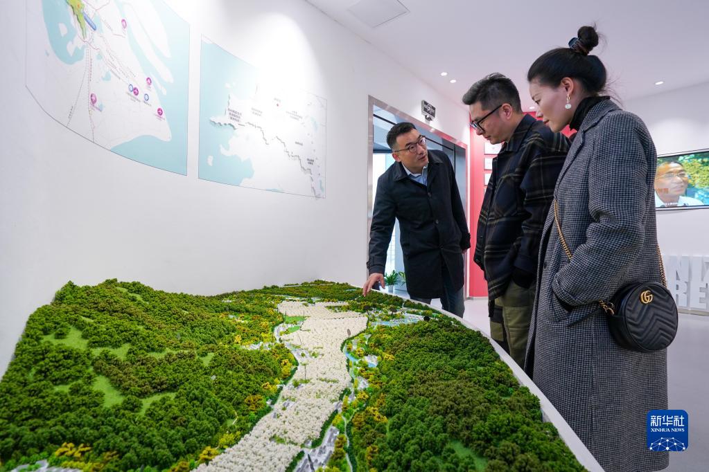 4月6日,在樹(shù)山村鄉村雙創(chuàng )中心,彭銳(左)為前來(lái)咨詢(xún)的客戶(hù)介紹樹(shù)山村基本情況。 新華社記者 李博 攝