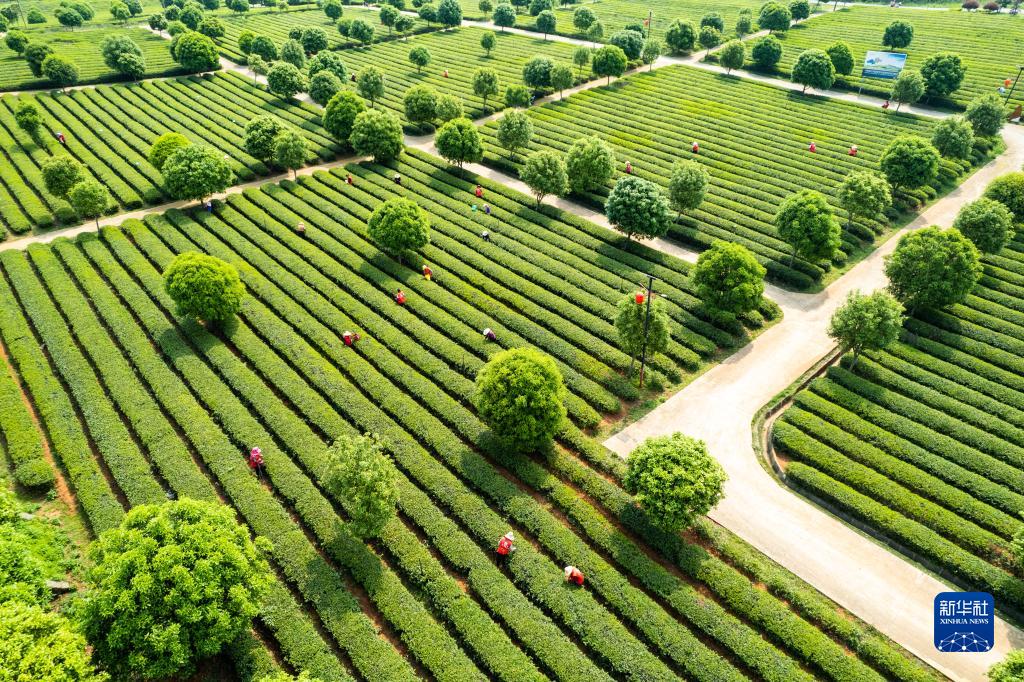 4月11日,在長(cháng)沙望城烏山貢茶基地,茶農采摘春茶(無(wú)人機照片)。