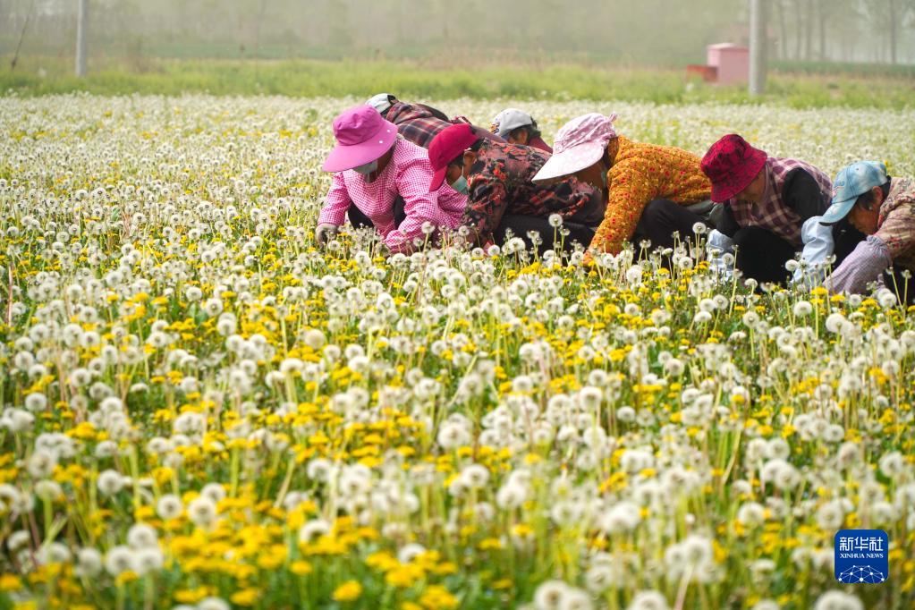 4月11日,在山東省單縣龍王廟鎮,村民在蒲公英種植田收割蒲公英。
