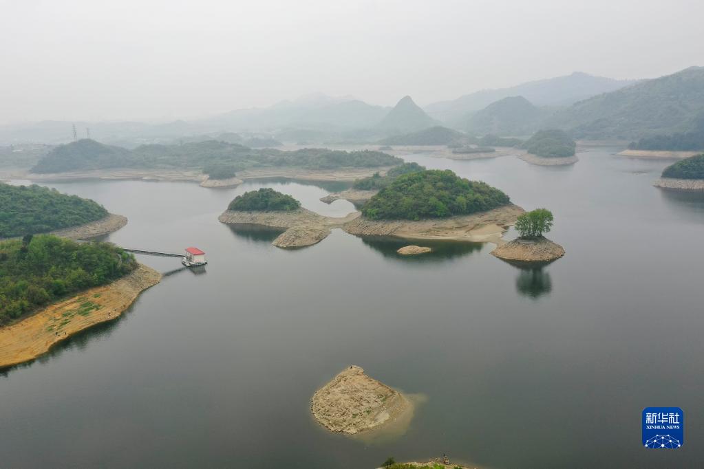 4月11日拍攝的阿哈水庫庫區一景(無(wú)人機照片)。