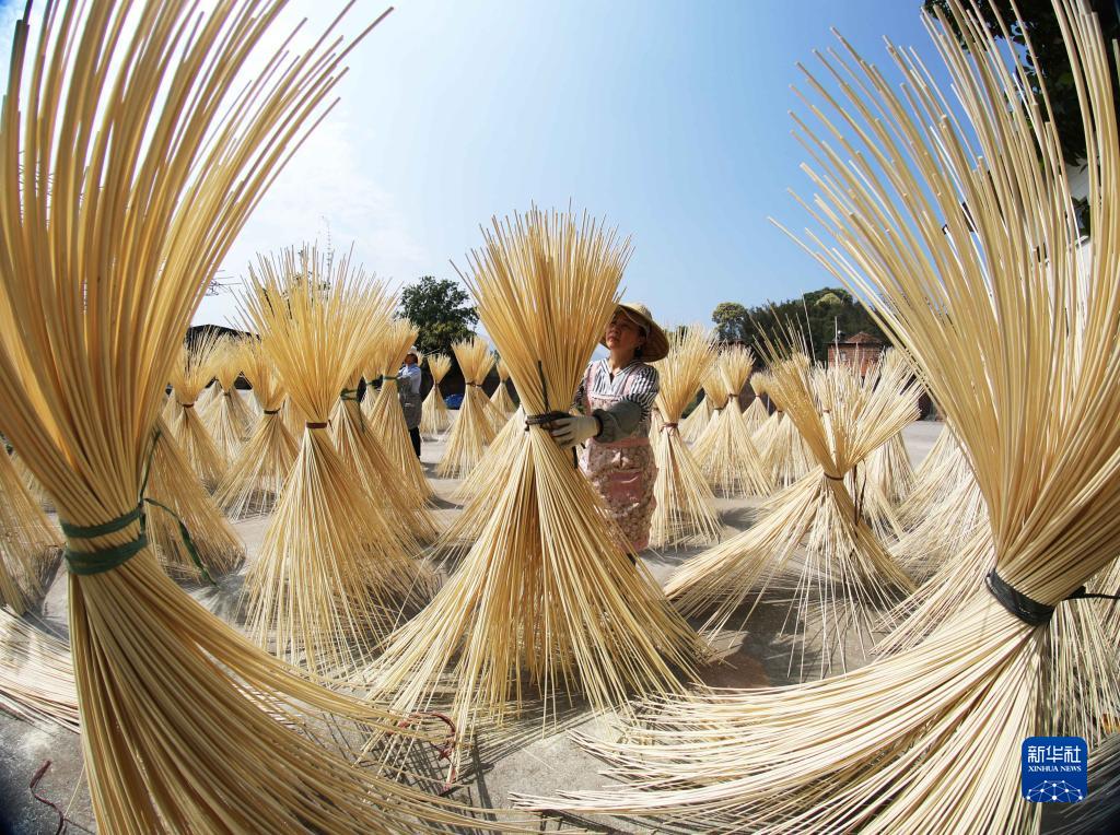 4月11日,在赤水市復興鎮太和村,工人晾曬竹絲。