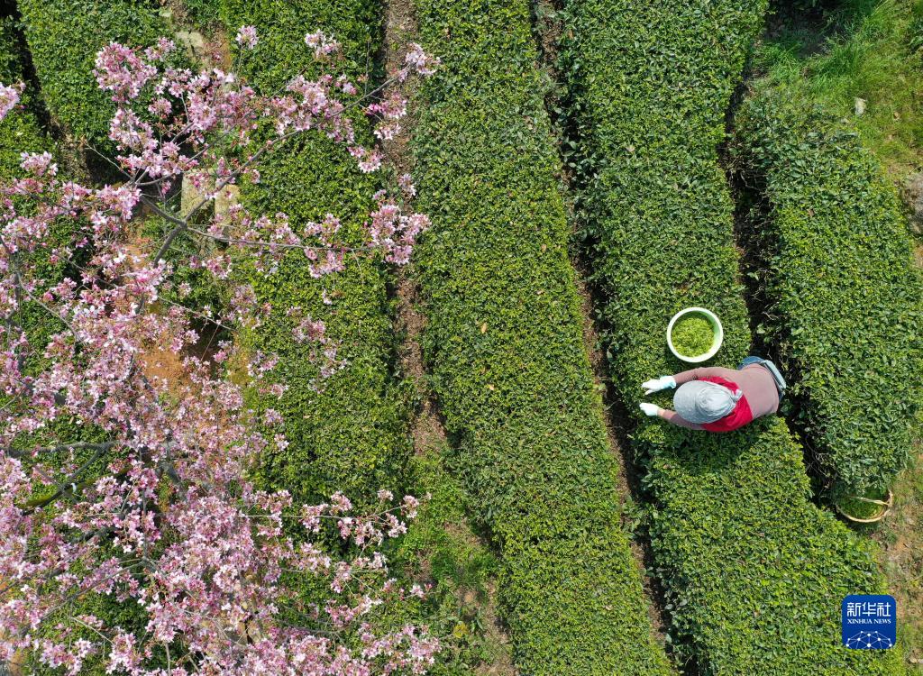 4月11日,村民在福建福鼎市佳陽(yáng)畬族鄉茶園采茶(無(wú)人機照片)。
