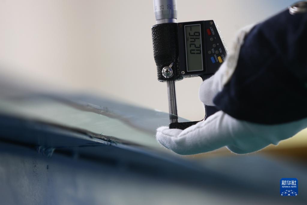 4月11日,在永清縣一家超薄玻璃生產(chǎn)企業(yè),技術(shù)人員在檢查玻璃質(zhì)量。