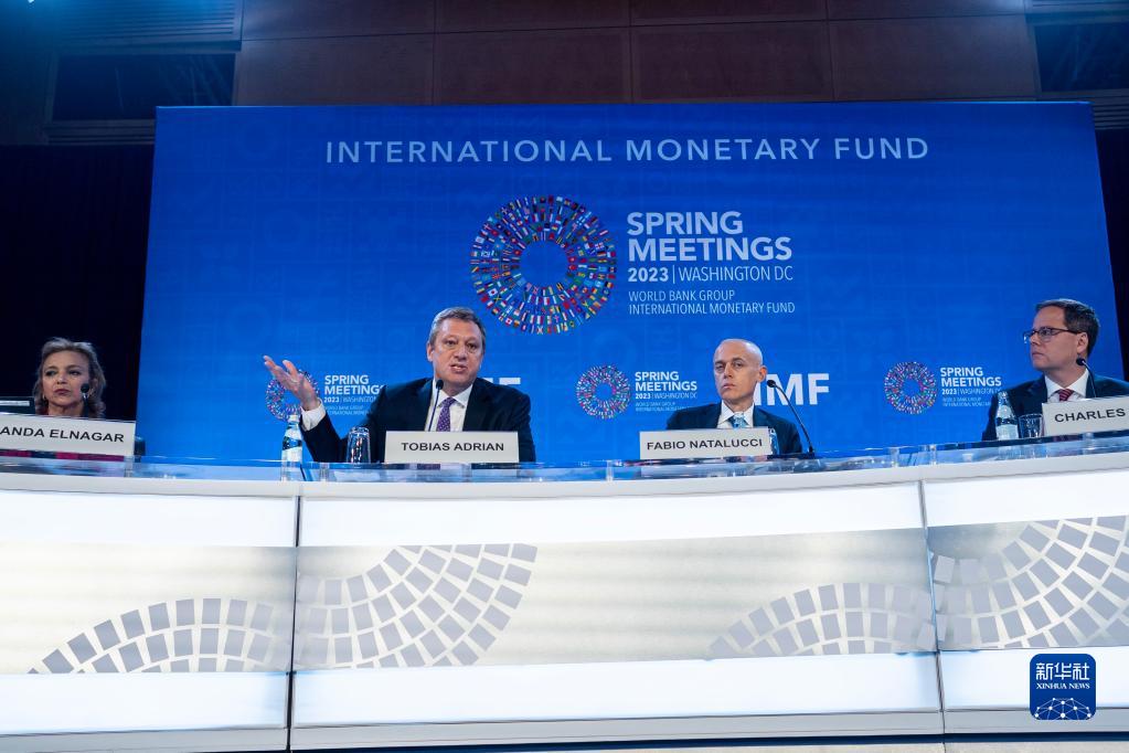 4月11日,在美國華盛頓,IMF貨幣與資本市場(chǎng)部主任托比亞斯·阿德里安(左二)出席記者會(huì )。