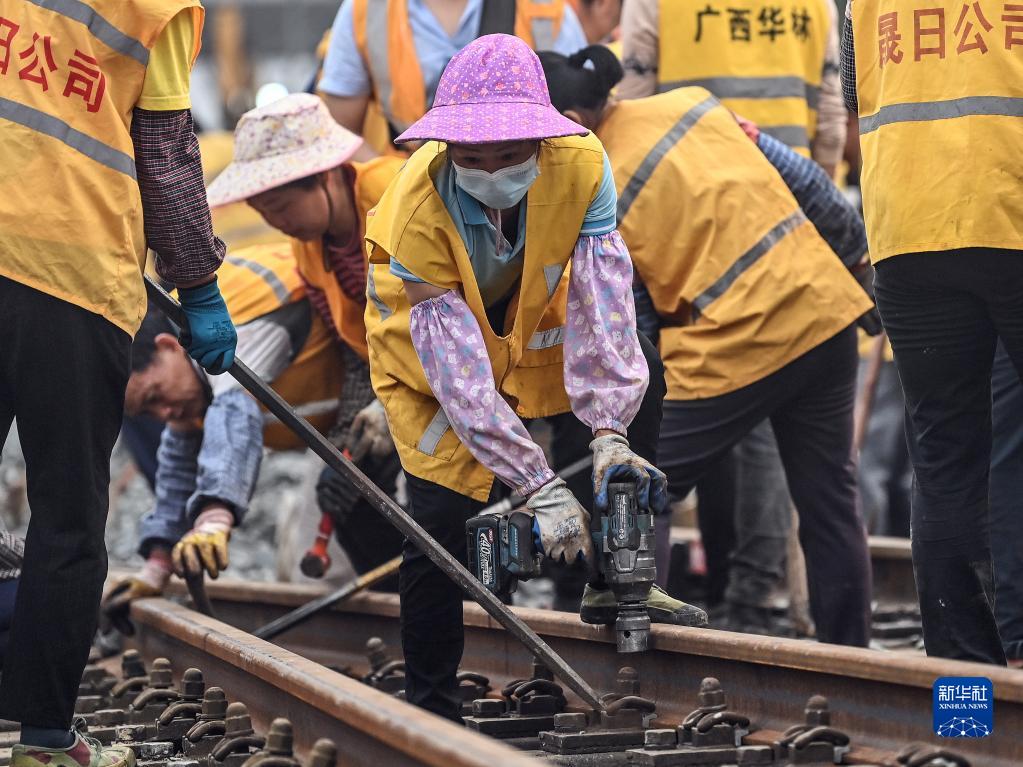 4月12日,在廣西欽州港站,工人在鋪設新鐵軌。