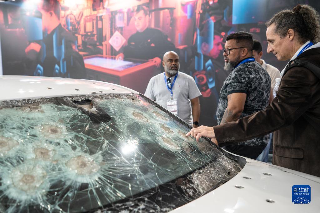 4月11日,在巴西里約熱內盧,參觀(guān)者在巴西防務(wù)展上觀(guān)看經(jīng)過(guò)加固防護的車(chē)輛。