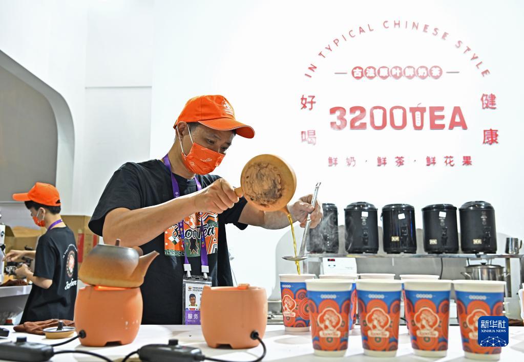 4月12日,消博會(huì )一家展臺的工作人員現場(chǎng)制作奶茶。