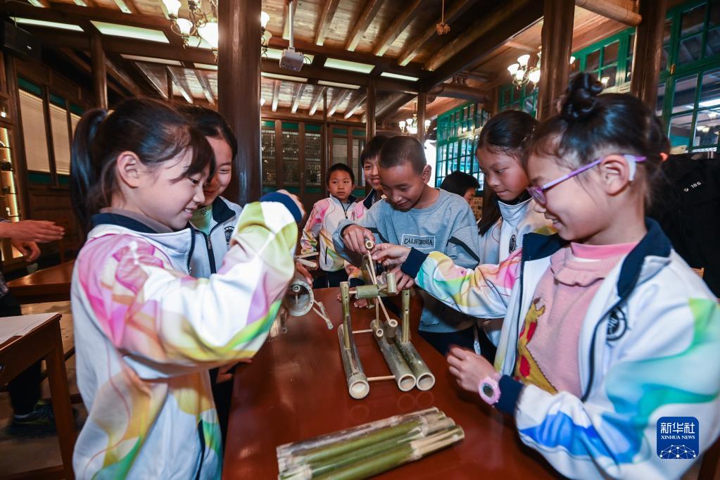 4月12日,諸暨市東白湖鎮斯民小學(xué)的學(xué)生在上傳統手工竹藝課。