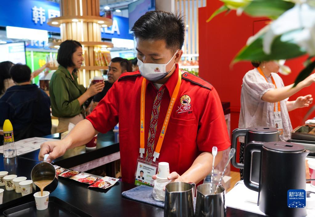 4月12日,工作人員在為參觀(guān)者沖泡一款產(chǎn)自印尼的咖啡。