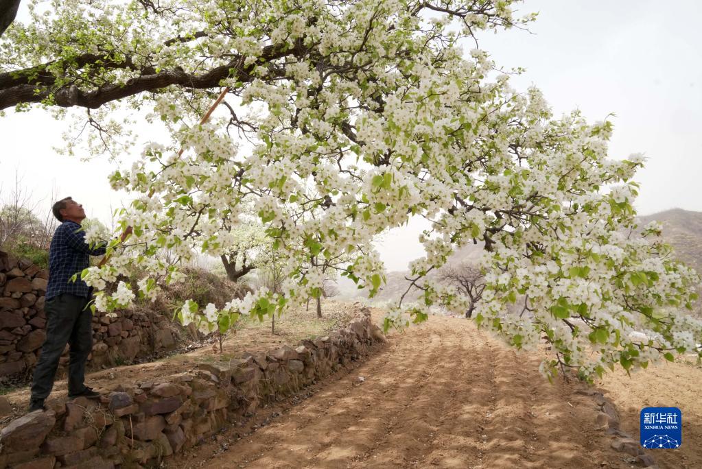 4月12日,河北省青龍滿(mǎn)族自治縣官場(chǎng)鄉山嶺高村的農民在管護旱作梯田間的安梨樹(shù)。