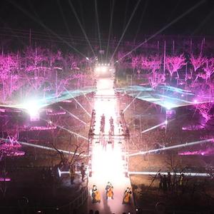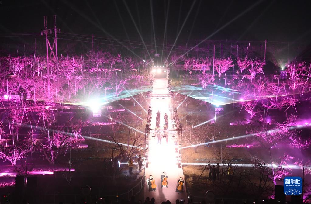 4月12日在第二十五屆北京平谷國際桃花節活動(dòng)現場(chǎng)拍攝的燈光秀。