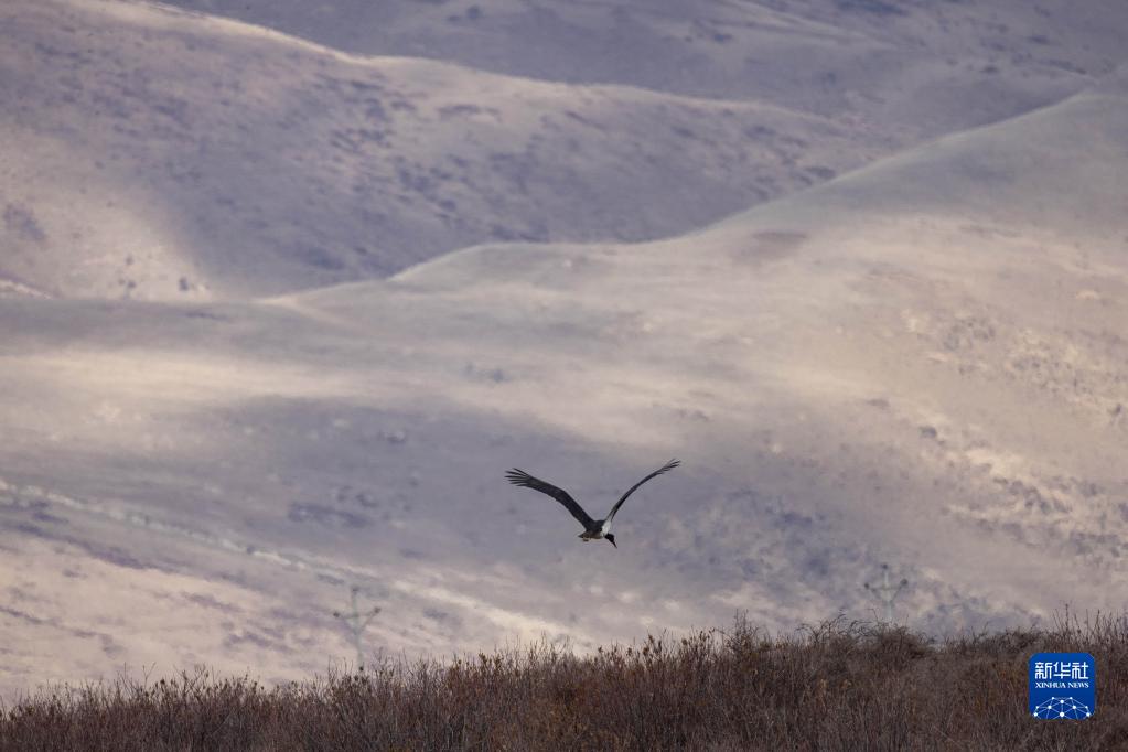4月12日,黑鸛在色達縣康勒鄉河灘邊展翅飛翔。