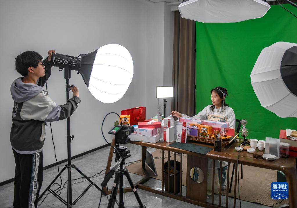 4月12日,在泰安市岱岳區的一家黃精加工企業(yè)內,工作人員通過(guò)電商直播形式銷(xiāo)售產(chǎn)品。