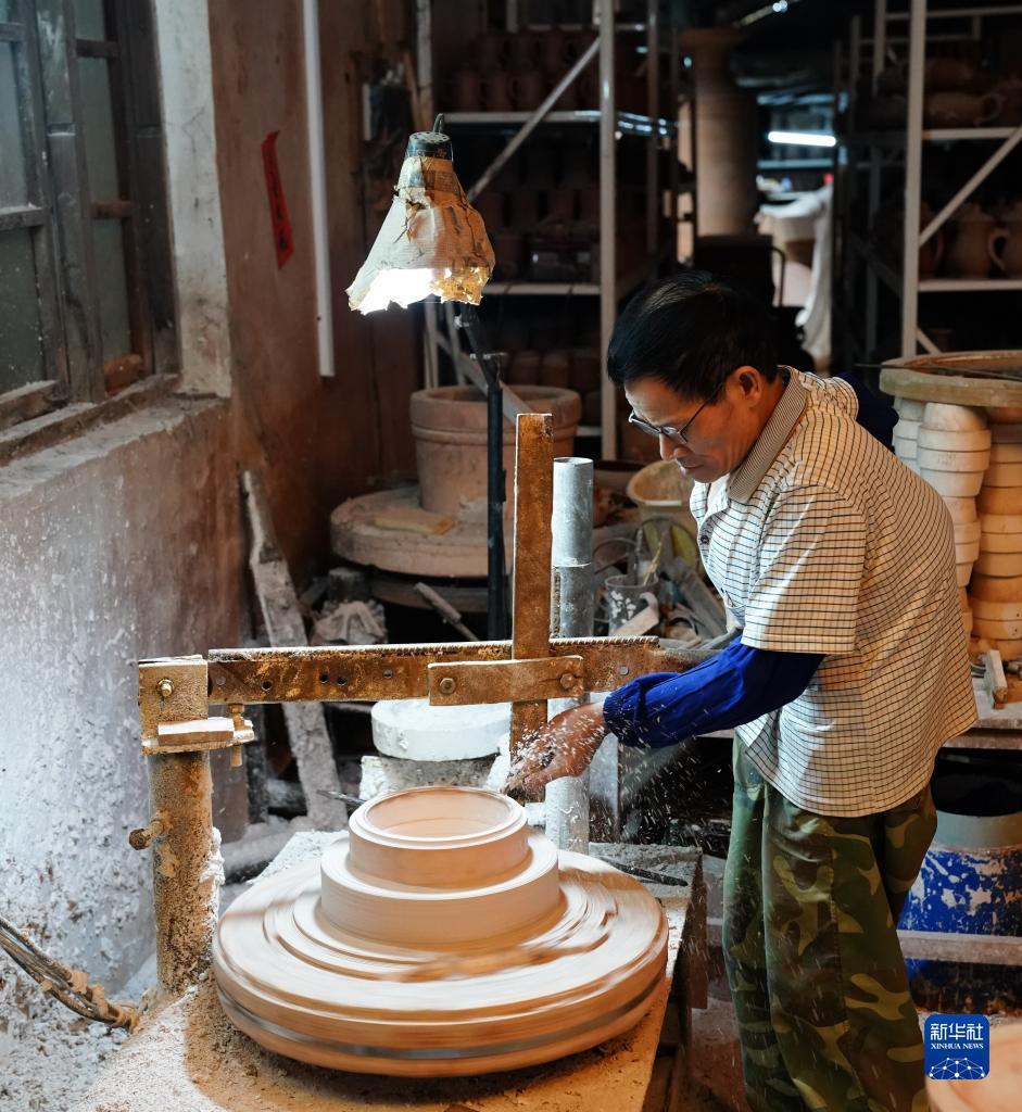 4月12日,在廣西欽州市,員工在坭興陶生產(chǎn)車(chē)間制作模具。
