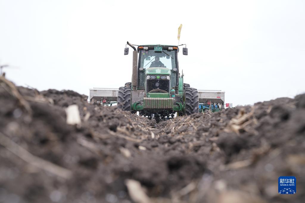 4月12日,在建設農場(chǎng)有限公司一處農田中,許志國駕駛大型拖拉機進(jìn)行分層定量施肥作業(yè)。