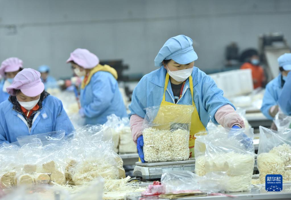 4月13日,河北省臨西縣一家食用菌生產(chǎn)企業(yè)的員工在包裝車(chē)間分揀金針菇。